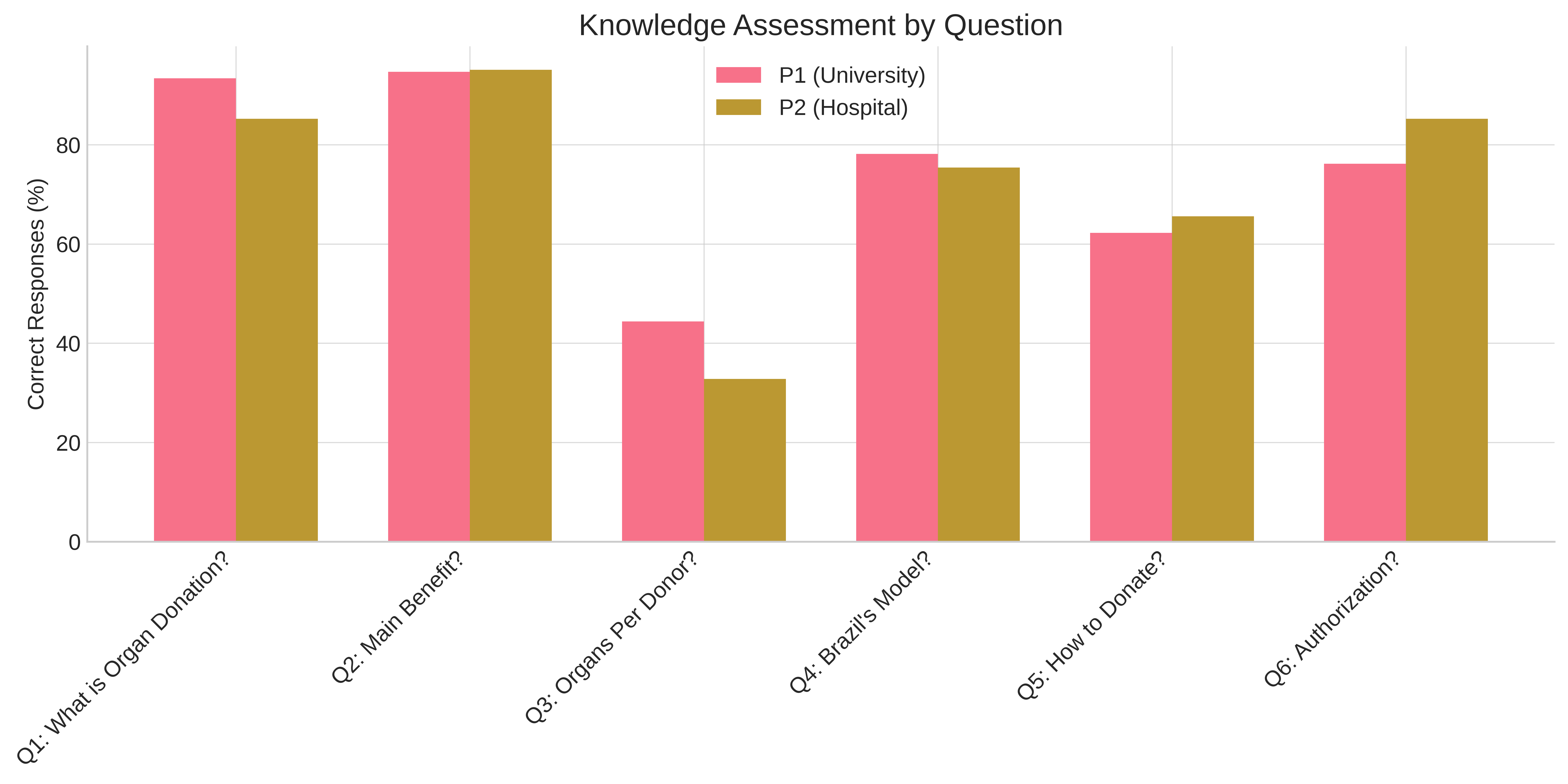 Results: Participants showed high engagement (79% average correct answers). Key gaps were identified: 66% didn't understand family authorization requirements (p=0.039), and 58% underestimated potential organs donated per donor. Significant differences existed between age groups (median 21 vs 35 years, p=0.018). 100% rated the experience positively.