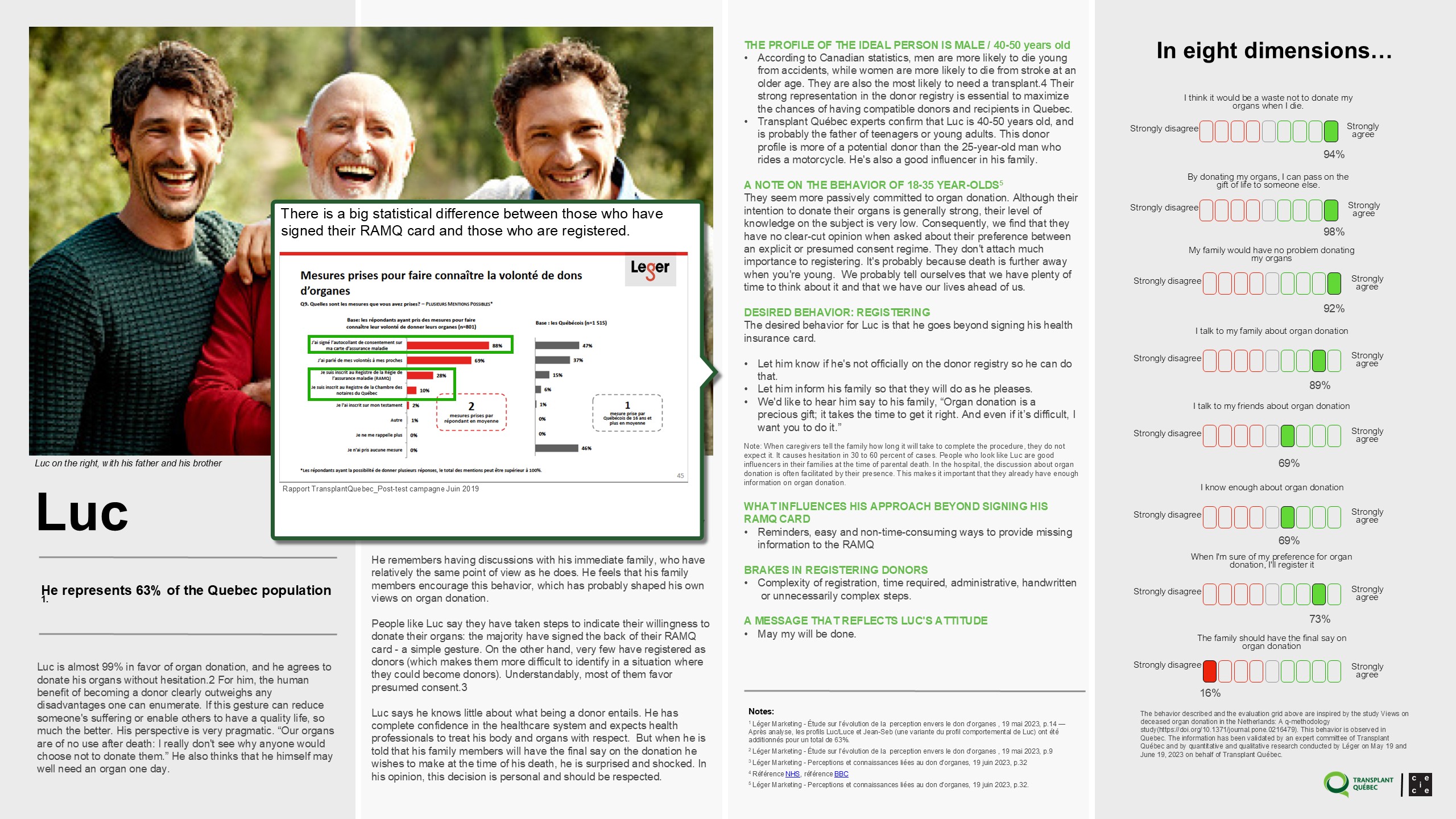 The strategic communications company hired by Transplant Québec to assist in the persona development process was Companie and cie. The company hired by Transplant Québec to implement the public polls and focus groups that partially informed the personas was Leger. Linda Benoit of Transplant Québec was instrumental in translating the personas from French to English for the purposes of this article.