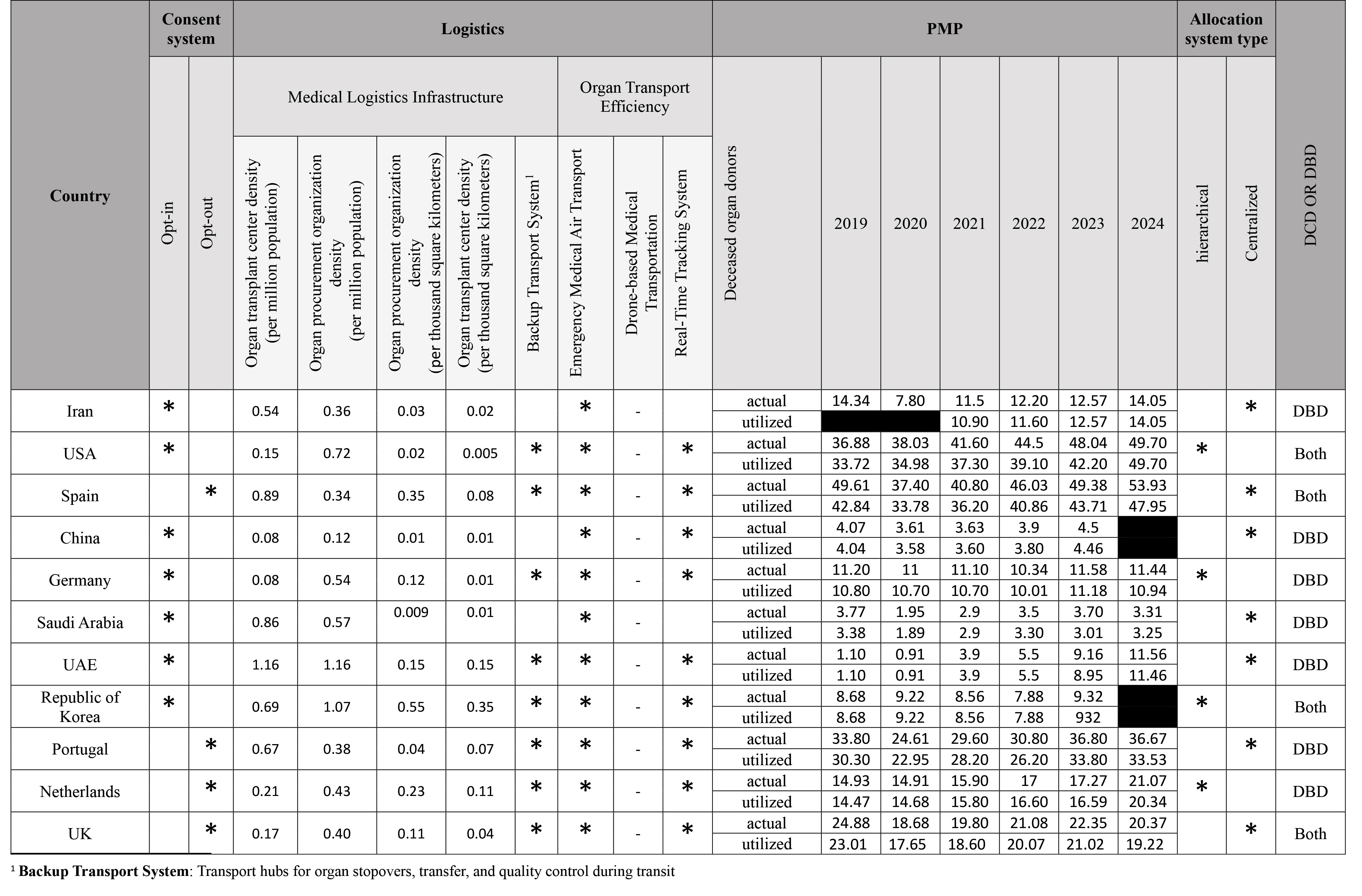 Method: A cross-country comparative analysis was conducted using data from the WHO, Global Organ Donation Network, and other sources. Key indicators included: Density of procurement and transplant units, Donors per million population (PMP), Backup transport systems, Consent system type (opt-in/opt-out), Allocation system (centralized/hierarchical), Real-time tracking systems, Type of post-mortem donation (DCD/DBD).