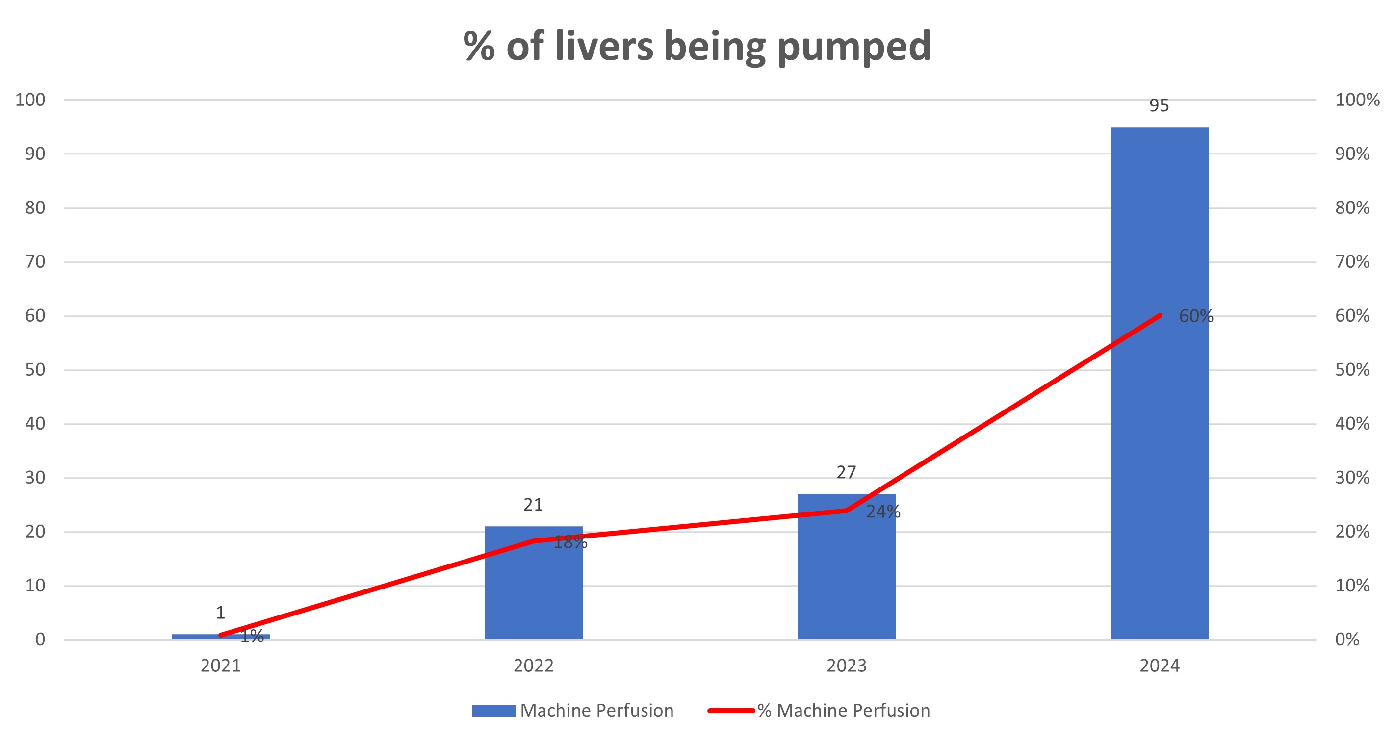 Method: Over two years, the OPO collaborated with a perfusion device manufacturer to develop an implementation pathway. Upon securing dedicated access to a perfusion machine, the program was launched within one month. This included extensive training for surgical teams on organ initiation and transplant center staff on liver removal, as well as laboratory validation for point-of-care iStat testing during transport. Two full-time device specialists from the OPO traveled with the machine to ensure safe and effective use.