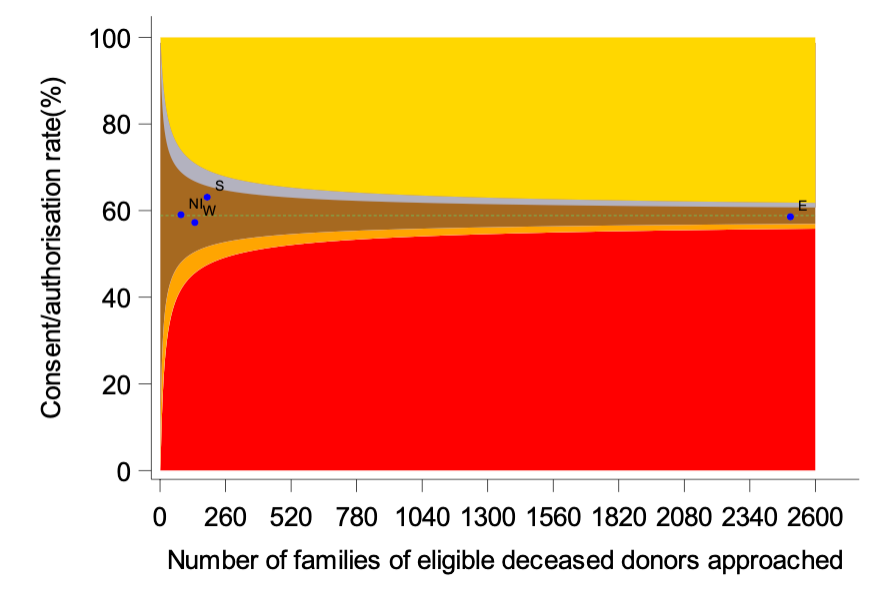 Funnel plot statistical analysis reveals there is no statistical difference between all four nations of the UK in consent/authorisation overall, though owing to population differences, England dominates the funnel plot.