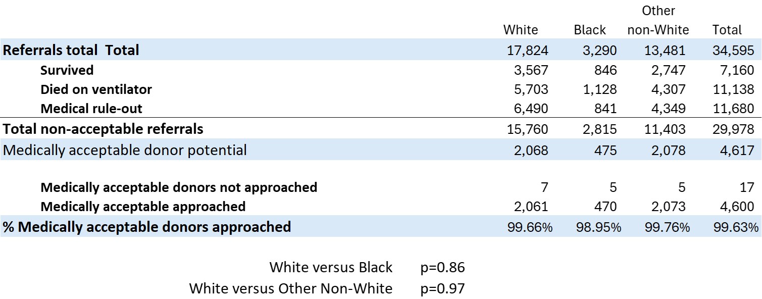 Results: There were 4,617 medically acceptable donors, families of 4,600 were approached for donation authorization and 17 were not approached (0.37% of medically acceptable cases and 0.05% of referrals). Of these, 15 had reflexes present and were expected to survive; 2 did not have clear reasons documented for case closure. There were 7 White, 5 Black, and 5 Other non-White not approached. Overall 99% of medically acceptable potential donors were approached for authorization in each racial group (Table 1). Within each OPO there was no statistical difference between family approaches of White, Black, and other non-White groups.