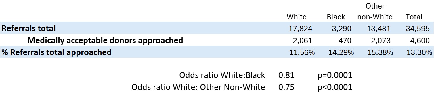 Methods: Records of all donor referrals made to 5 U.S. OPOs in 2023 were reviewed using the previously described methodology. Referrals were categorized as medical rule-out, missed, or medically acceptable. Medically acceptable referrals approached and not approached were compared by race.