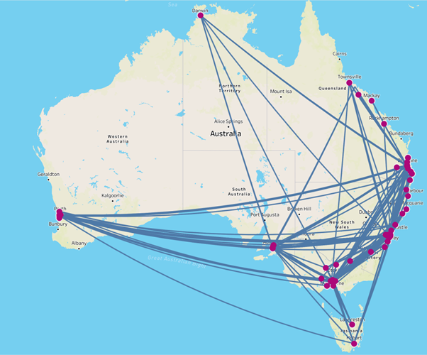 In Australia the geographic spread of the population means that donation hospitals and transplant units can be more than 3,500 kilometres apart. Organs are allocated and transplanted interstate due to national urgency, allocation priority or when there are no suitable recipients within the state of donation. Even for organs allocated withing the state of donation retrieval teams can be required to travel more than 1,400 kilometres each way to retrieve organs. The movement of organs from donor hospital to transplant unit across Australia in 2024 is shown below: