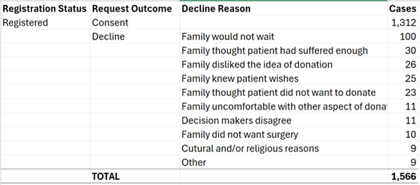 Results: Between 2020 and 2024, there were 1,566 requests from registered potential donors with a consent rate of 84%. The data show that the most common reason for decline was that the family was not prepared to wait the time required for organ donation to occur (n = 100).