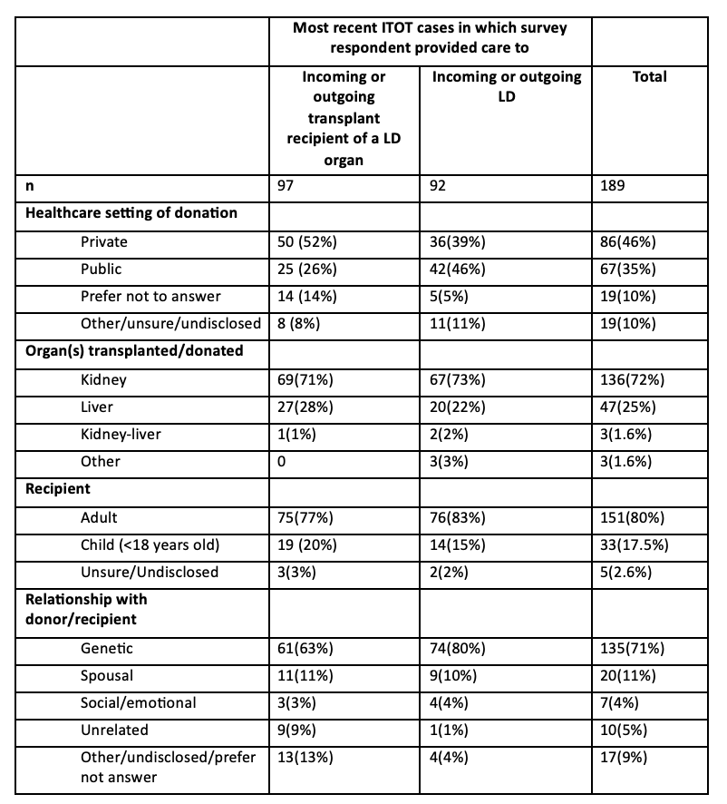 Results: 353 individuals from 64 countries completed the survey. 309 were clinically active between 1 Jan 2023 and 31 Aug 2024, of whom 166 (54%) had provided care for ≥1 incoming or outgoing LD or transplant recipient. Of the 164 most recent incoming or outgoing transplant recipient cases reported, 59% (n=97) involved LD transplants. Considering only respondents’ most recent experiences of providing care to incoming or outgoing donors, 68 (42%) reported having cared for ≥1 incoming LD, whereas 24 (15%) had cared for ≥1 outgoing LD. These 92 LDs were from 47 countries who underwent donation in 31 different countries. LDs more commonly donated in private healthcare settings to adult recipients with whom a genetic relationship was claimed (see Table 1). Kidney transplants comprised the majority (72%) of ITOT cases involving LDs.