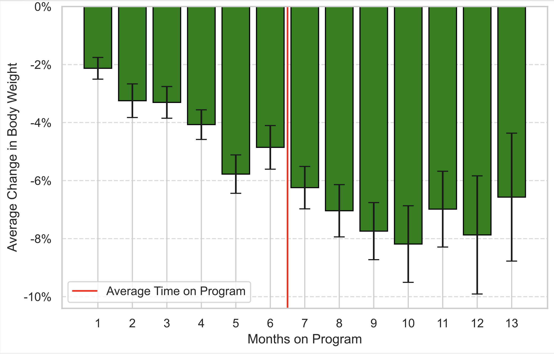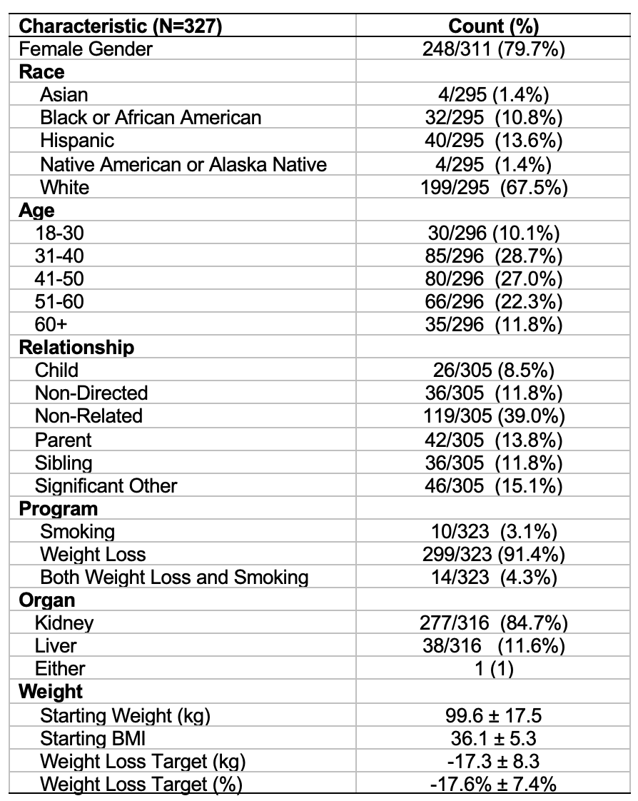 Results: Between 5/13/2022 and 1/8/2025, 680 participants from 46 U.S. states, 3 countries, and 97 transplant centers were onboarded, including 598 intended kidney donors and 65 intended liver donors. Among the 327 participants who completed the program, 67 (21%) reached their pre-donation goal (Figure 1). Of those, 53 (16%) donated a kidney or liver. The average time to reach the goal was 190±129 days. Participants with weight loss goals (N=313) lost an average of 4.8±5.8 kg, or 4.9% of their starting body weight (Figure 2). Among those who reached donation, average weight loss was 6.2±5.4 kg. Donation was achieved by 49 kidney and 4 liver donors. Among the 14 who reached their goal but have not donated, 2 are approved for surgery, 1 is in evaluation, and 11 have been delayed for donor or recipient-related reasons.