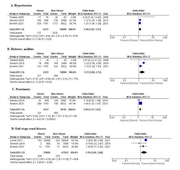Results: Thirty-three cohort studies were considered in the final review among which only six reported long-term outcomes (Figure 1). Three (3) studies accounting for 12,433 patients showed that obese patients have a significantly higher odds of developing hypertension compared to non-obese patients (OR: 1.28, 95% CI: 1.05-1.57). Similarly, Obese donors have significantly higher odds of developing diabetes mellitus 1.72 (95% CI: 1.08-2.74) and proteinuria (OR = 1.40, 95% CI: 1.21–1.61). Lastly, three studies accounting for 90,927 patients showed that obese donors had a higher odd of developing end-stage renal disease 1.76 (95% CI: 1.04-3.00, p=0.04, I² = 56%). The difference in incidence of cardiovascular disease, creatinine and eGFR in obese versus non-obese LKDs was not significant. The certainty of evidence evaluated using GRADE showed low certainty in three outcomes, moderate in two outcomes and high in two outcomes highlighting confidence in the overall results.