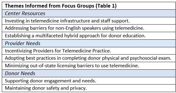 Results: Eight key themes emerged from the focus groups, including center resources, provider, and donor needs.