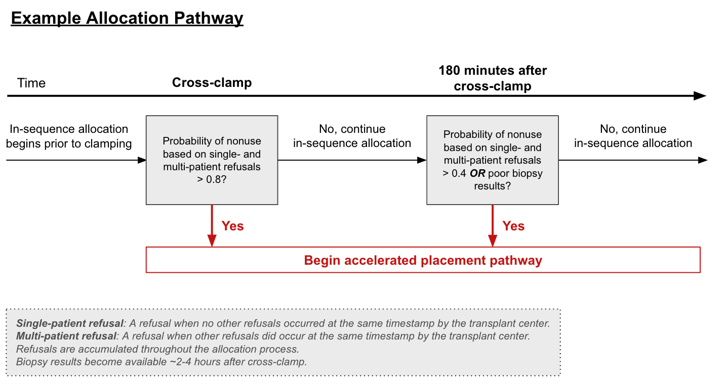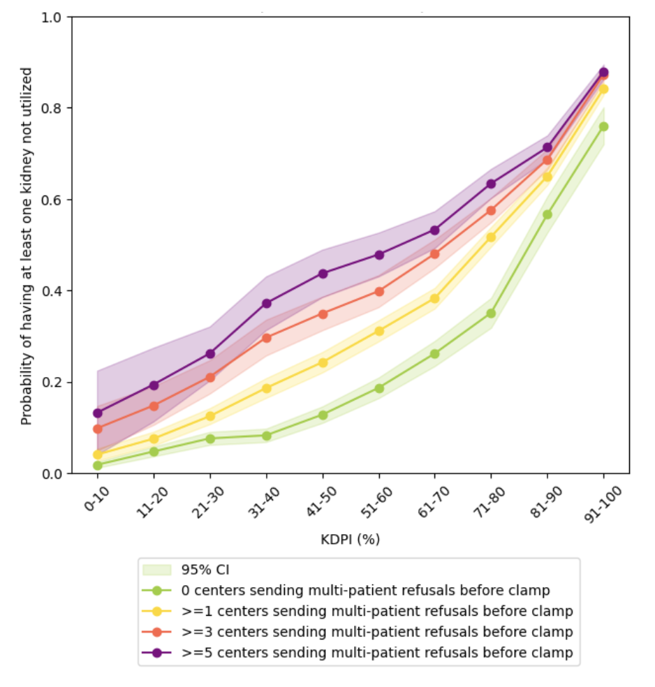 Conclusions: There could be many valid clinical concerns regarding a donor that are not represented in the KDPI or any other risk index based on registry data. These include the concerns for infection or malignancy, anatomical or surgical aberrations, procurement issues, and other medical factors. Multi-patient refusals, even those prior to cross-clamp, can identify hard-to-place organs reliably regardless of the specific reason and without need for additional data collection, making it a highly promising tool for developing accelerated pathways of kidney allocation (example given in Figure 2). For example, the historical probability of nonutilization based on single- and multi-patient refusals can be calculated and used to determine when to begin an accelerated placement pathway. The threshold for these policies can be adjusted based on organ-specific factors, as well as cold ischemia time. The time of decision making is flexible and can be performed at any point during the allocation process.