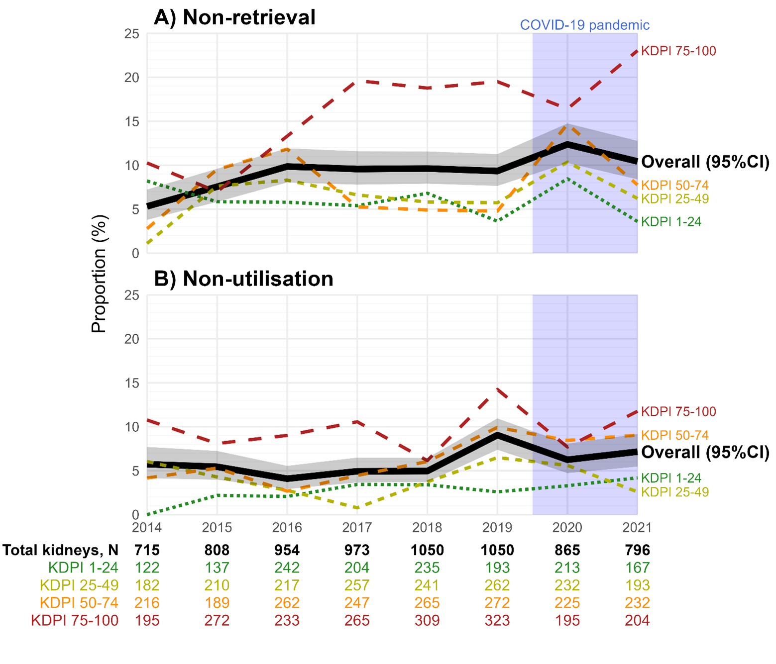 Results: Among 7,211 kidneys (3,683 donors) accepted for retrieval, 675 (9%) were non-retrieved and 430 (7%) were non-utilised. Crude non-retrieval rates doubled from 5% to 10% between 2014-2021 (p=0.01) while non-utilisation remained around 7% (p=0.1, Figure 1). After adjustment, non-retrieval was greater among donors with KDPI≥75 (OR 4.28, 95%CI: 2.08–8.81, p<0.001), diabetes (OR 1.74, 95%CI: 1.25–2.43, p=0.001), and in recent years (annual OR 1.08, 95%CI: 1.03–1.55, p=0.002), and lower for ECD DCDD (OR 0.46, 95%CI: 0.26-0.81, p=0.01). Non-utilisation was greater for SCD DCDD (OR 1.90, 95%CI: 1.28-2.82, p<0.001), blood group AB (OR 2.05, 95%CI: 1.16-3.64, p=0.03) and in recent years (annual OR 1.08, 95%CI: 1.02-1.15, p=0.01), and lower in Tasmania (OR 0.28, 95%CI: 0.08-0.97) and Queensland (OR 0.57, 95%CI: 0.36-0.92, p=0.03). Documented reasons for non-utilisation lacked transparency but included poor perfusion (17%).