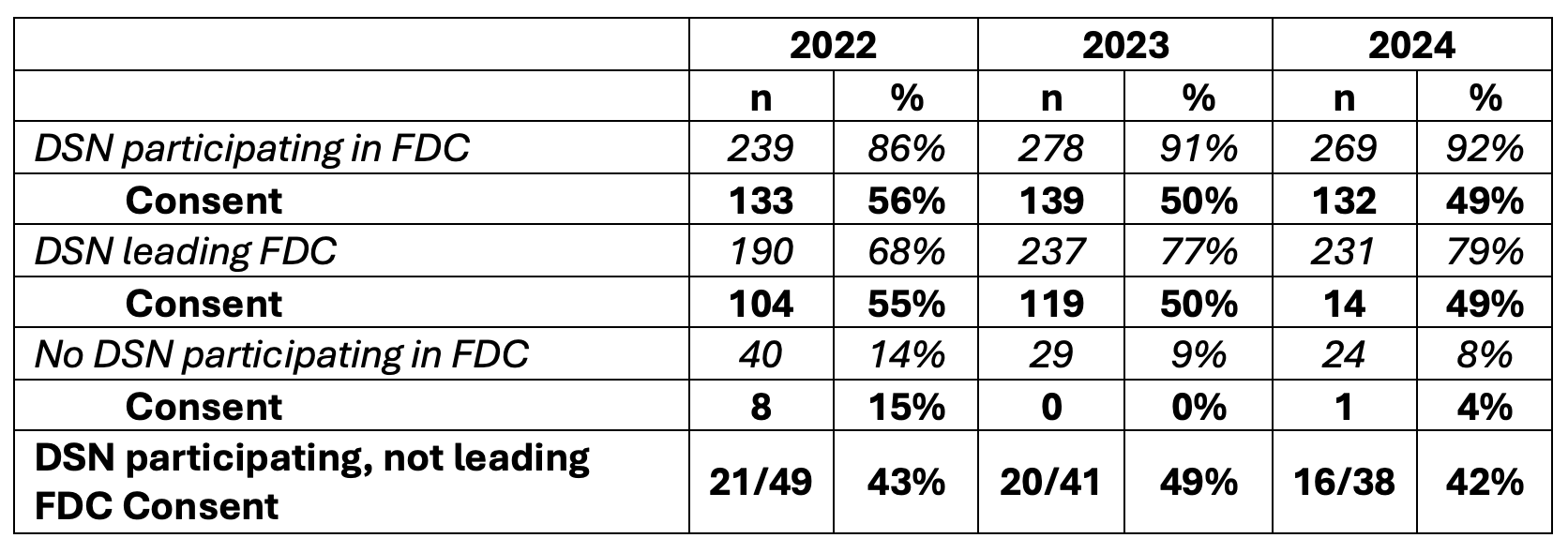 Method: We identified FDCs occurring in NSW DonateLife Network hospitals in 2022 - 2024 after hospital staff first raised donation, from both the DLA and the NSW RL, and determined the consent rate to donation when a DSN was listed as participating in the conversation (DLA) or leading the conversation (RL).