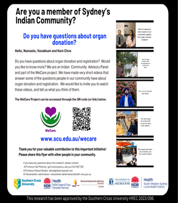 Conclusion: The findings emphasize the vital impact of culturally tailored strategies in encouraging migrant communities to engage with organ donation and registration. Notably, the Indian Community Advisory Panel played a key role in the co-creation and dissemination process, fostering engagement with Australia’s organ donation practices by building familiarity and trust. This highlights the significance of community-led initiatives and reinforces the need to move beyond broad CALD-focused approaches.