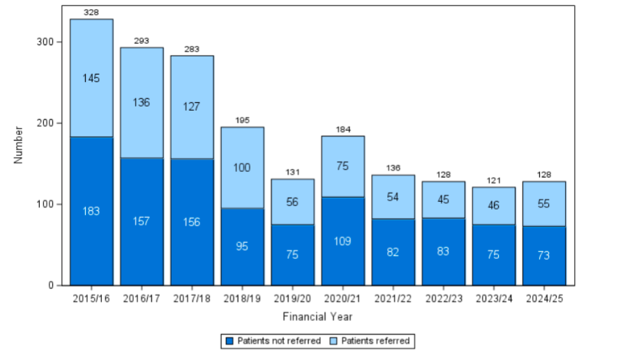 Results: Over the last 10 years, the number of patients who died in the ED meeting referral criteria has decreased, from 328 in 2015/16 to 128 in 2024/25. During the same period the proportion of patients who were not referred has remained similar, 56% in 2015/16 to 57% in 2024/25. In the past year the most common reason for not referring was that the patient was ‘not identified as a potential donor/organ donation not considered’ (n=53, 72.6%).
