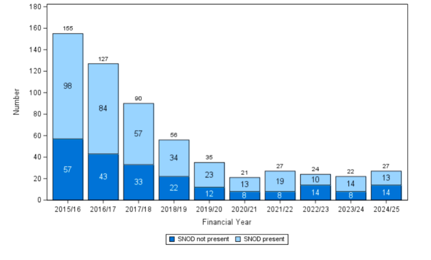 Over the last 10 years, the number of families approached in the ED has decreased, from 155 in 2015/16 to 27 in 2024/25. The proportion of families approached with no Specialist Nurse for Organ Donation (SNOD) present has increased even as the absolute numbers have declined, 37% (n=57) in 2015/16 to 52% (n=14) in 2024/25. In the past year the most common reason for not involving a SNOD in the family approach was ‘planned to proceed without SNOD team member’ (n=5, 35.7%).
