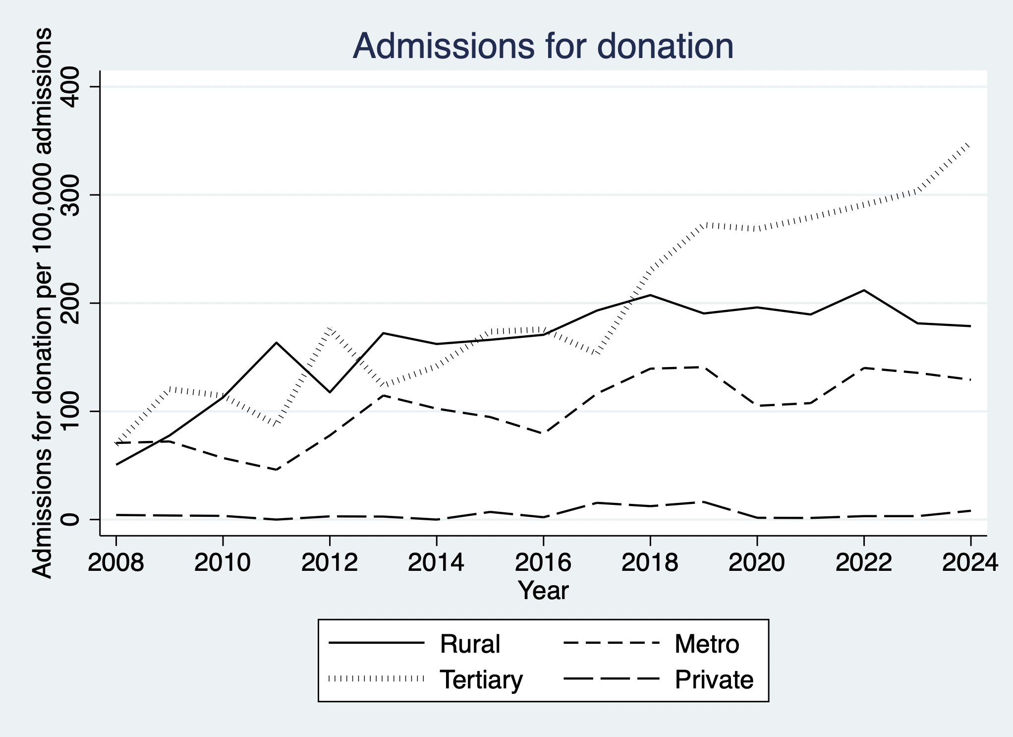Results: Between 2008 and 2024, 2,506,626 patients were admitted to Australian ICUs contributing to the registry, of whom 3,078 were admitted for consideration of organ donation. The overall rate of such admissions increased more than threefold (from 50 to 178 per 100,000 admissions per year, p<0.01). Tertiary hospitals showed significantly greater increase than rural, metro or private hospitals (p<0.01; Figure 1).