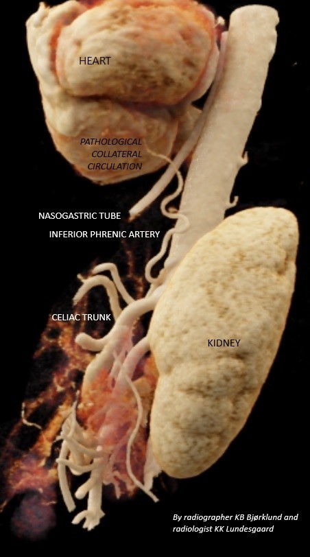 At autopsy, a fibrous attachment between the diaphragm and heart base containing an identifiable vessel was revealed, suggesting probable collateral circulation. Re-evaluation of the CT scan provided evidence of potential collateral circulation from the inferior phrenic artery to a coronary artery branch.