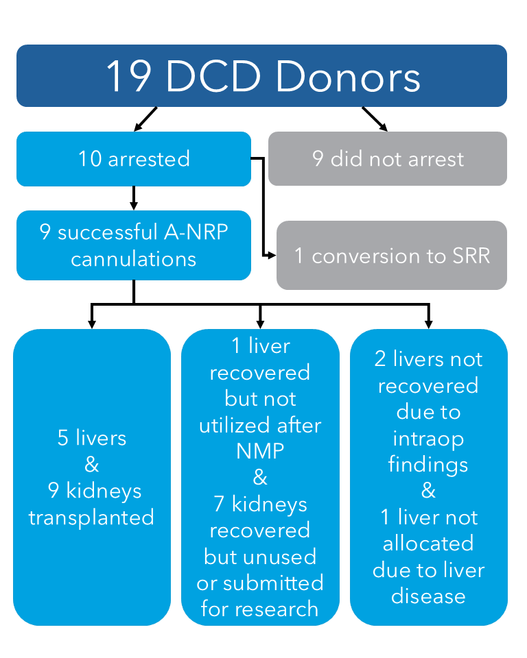 Conclusions: With careful planning, OPOs can successfully develop and implement A-NRP programs. Vigilant communication and collaboration are essential for programmatic success, particularly for cases with extended OR times. With support from hospital partners, we plan to expand the use of A-NRP for all adult DCD donors.