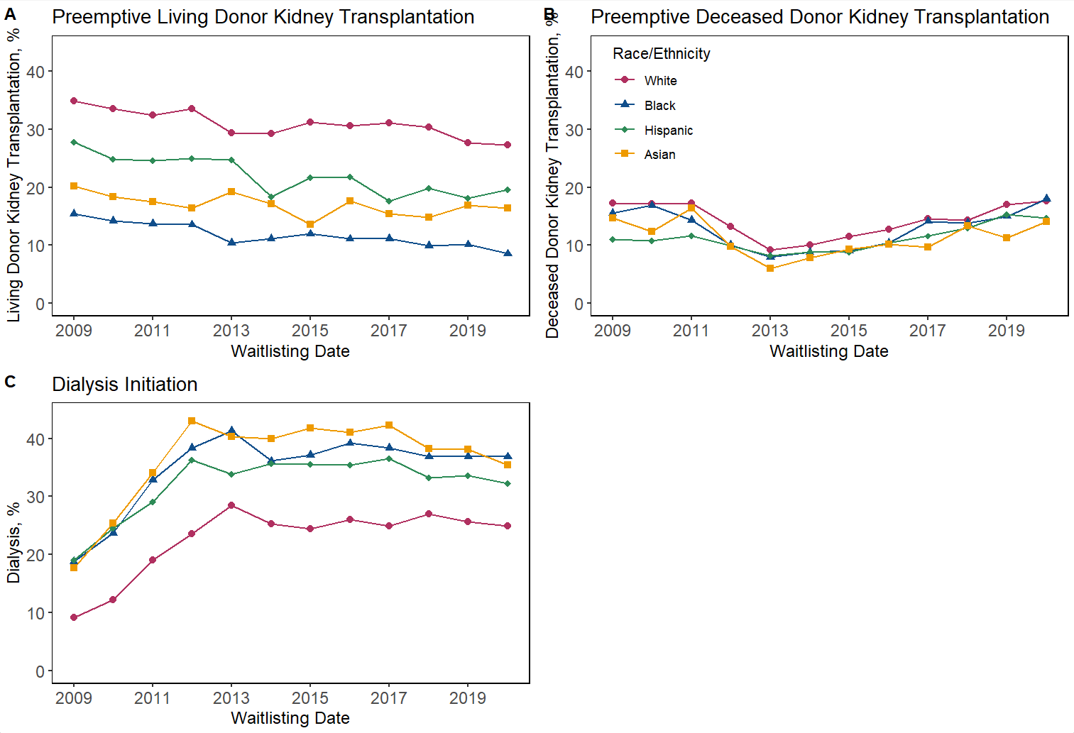 Results: Among 98,936 preemptively waitlisted adults (median [IQR] age, 56 [46–64] years; 42% women), 60% were White, 19% Black, 13% Hispanic, 8% Asian. In every era, Black, Hispanic, and Asian patients were less likely to receive preemptive LDKT than White patients (era 2018–2020, aSHRs: 0.31 [95%CI, 0.29–0.34]; 0.60 [95%CI, 0.56–0.65]; and 0.49 [95%CI, 0.44–0.54], respectively). Black, Hispanic, and Asian patients were more likely to initiate dialysis than White patients (era 2018-2020, aSHRs: 1.41 [95%CI, 1.33–1.49]; 1.20 [95%CI, 1.13–1.28]; and 1.50 [95%CI, 1.39–1.61], respectively). In contrast, Black and Hispanic patients received preemptive DDKT as often as White patients (era 2018-2020, aSHRs: 0.99 [95%CI, 0.91–1.07] and 1.01 [95%CI, 0.92–1.11], respectively), while Asian patients were less likely to receive preemptive DDKT (aSHR: 0.77 [95%CI, 0.68–0.87]).