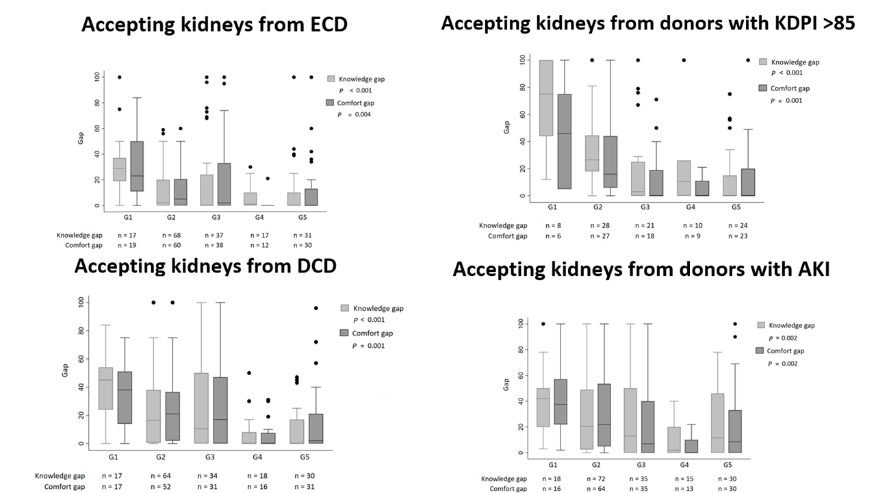 Methods: We conducted a global survey from May 2022 to March 2023, involving nephrologists and kidney Tx surgeons. Responders were stratified according to the mean DD rate per million population (PMP) from 2016-2021 (2020 was excluded because of the COVID-19 pandemic): 1) No DD reported, or no data provided to GODT; 2) <10; 3) 10-19.9; 4) 20-29.9; 5) >30 DD PMP. We used ANOVA with a linear trend to compare the median gap (desired minus current) for knowledge or comfort. For example, I am aware of the potential benefits of kidney transplantation from expanded criteria donors (ECD); however, I feel uncomfortable accepting them.
