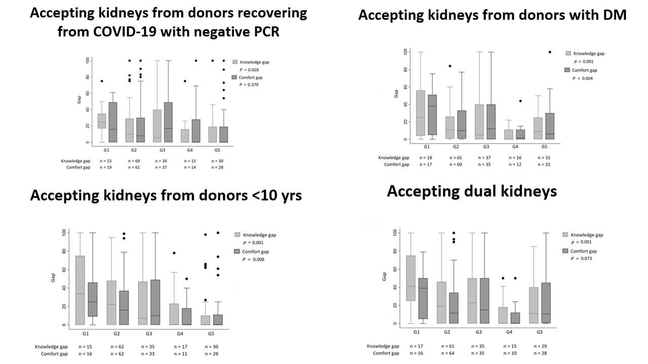Results: Of 438 responders, 170 were kidney Tx specialists. We found differences in knowledge and comfort gaps across countries, mainly in those with low DD rates. Gaps in knowledge and comfort for the acceptance of kidneys from DD are depicted in Fig.1: ECD, KDPI >85%, determination of death by circulatory criteria, acute kidney injury, and Fig.2: Donors recovering from COVID-19 with negative PCR, diabetic donors, dual kidneys, and donors <10 yrs.