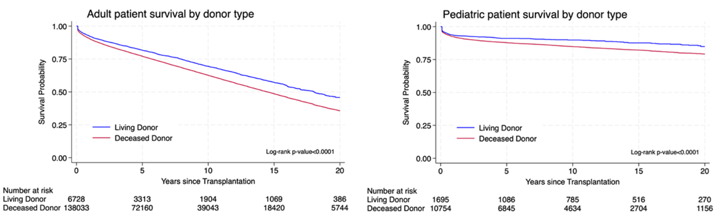 Results: Among adults, the survival probabilities at 10 and 20 years were 69.5% and 45.7% for living donor recipients versus 62.7% and 35.6% for deceased donor recipients. Living donor transplantation was associated with a 13% reduction in mortality risk (adjusted hazard ratio [aHR] 0.87; 95% CI 0.83–0.92; P = <0.001). Among pediatrics, the survival probabilities at 10 and 20 years were 89.8% and 84.9% for living donor recipients versus 84.9% and 79.2% for deceased donor recipients, with an adjusted mortality reduction of 24% (aHR 0.76; 95% CI 0.62–0.94; P <0.01).