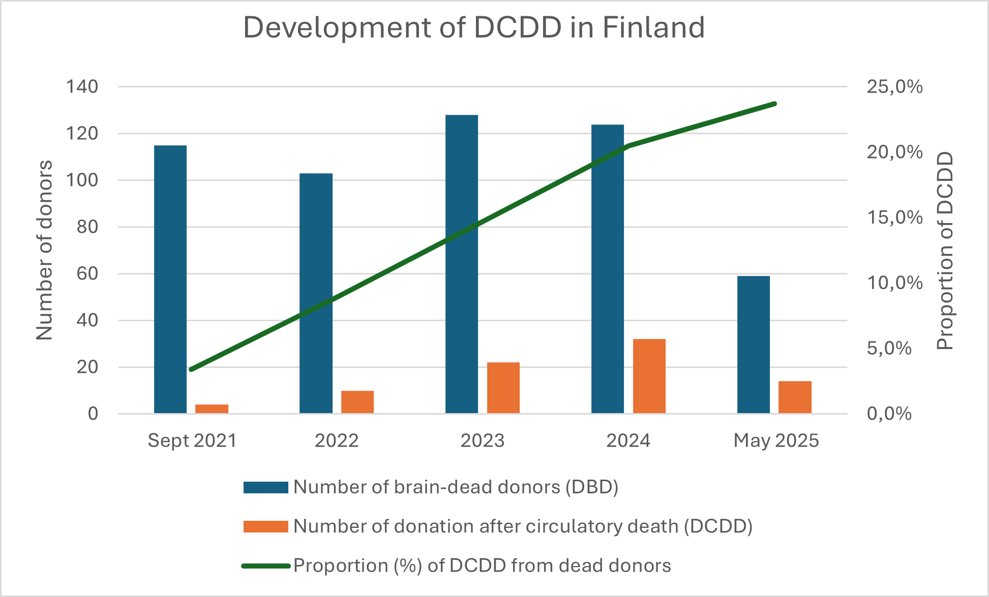 Introduction: The Finnish National Action Plan on Organ Donation and Transplantation aims to ensure equitable and timely access to transplantation for all patients medically indicated for this treatment. To achieve this goal, approximately 40 deceased organ donors per million population (pmp) are required. Until 2021, organ donation in Finland was limited exclusively to brain dead donors, yielding a donor rate of approximately 19–25 dead donors pmp. As the availability of organs directly constrains transplantation rates, donation after circulatory determination of death (DCDD) has been introduced as a complementary pathway alongside the existing brain death donation program to expand the donor pool.