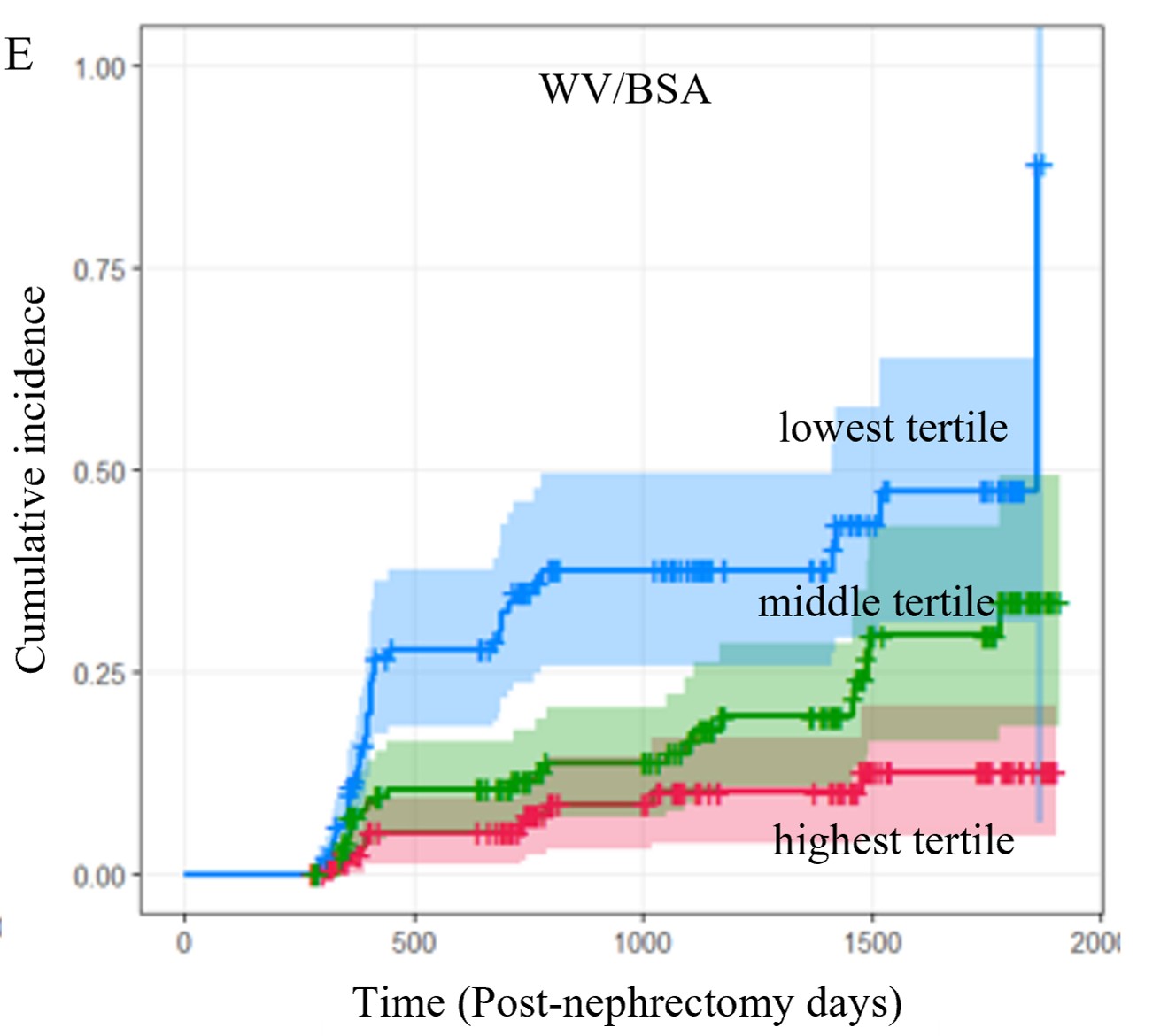 Results: Lower WV/BSA was independently associated with increased CKD risk at 1 year (OR, 0.93; p=0.0002) and 5 years (HR, 0.95; p<0.0001). Age, BMI, and baseline eGFR were also significant predictors (all p<0.05). WV/BSA correlated better with postdonation eGFR than unadjusted volumes.