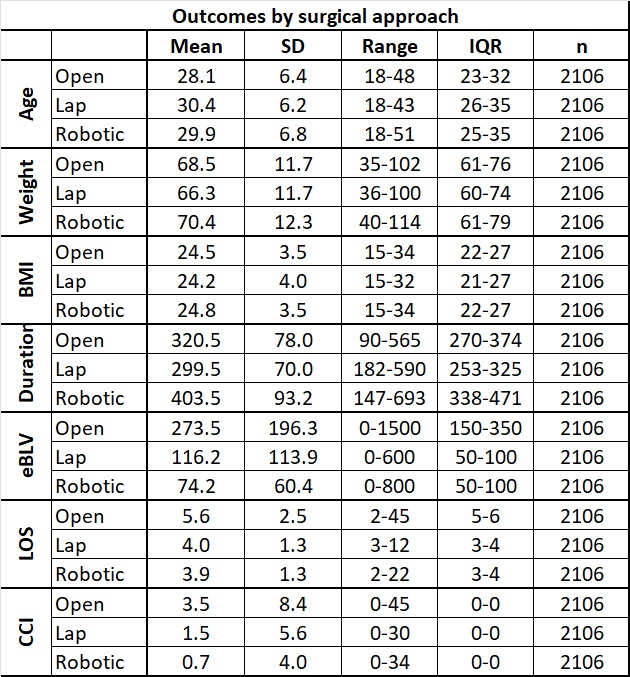 Results: The LDH (n=2106) surgical approach was Open (n=646), Laparoscopic (n=133), robotic (n=1289), laparoscopic assisted (n=32) or Robotic assisted (n=6); only 6 cases were converted to open (robotic=2). Right lobe was taken robotically in 609, Left in 296, and Left Lateral (LL) in 384 cases. A total of 188 complications of any severity were recorded in 165 patients, of which only 7 were major (Clavein Dindo grade ≥3a); Comprehensive Complication Index (CCI®) scores (n=165, 7.8%, range 0 – 44.8,) were lower (0 – 33.7) and less frequent (n=46, 3.5%) in the Robotic group and the Left Lobe. Robotic surgery took an average of extra 103 or 84 minutes from Open or Laparoscopic approaches; however, the lower mean blood loss by 210 mls or 43 mls, respectively. Similarly, they discharged from hospital on average 1.69 or 0.48 days sooner than the Open or Laparoscopic groups.