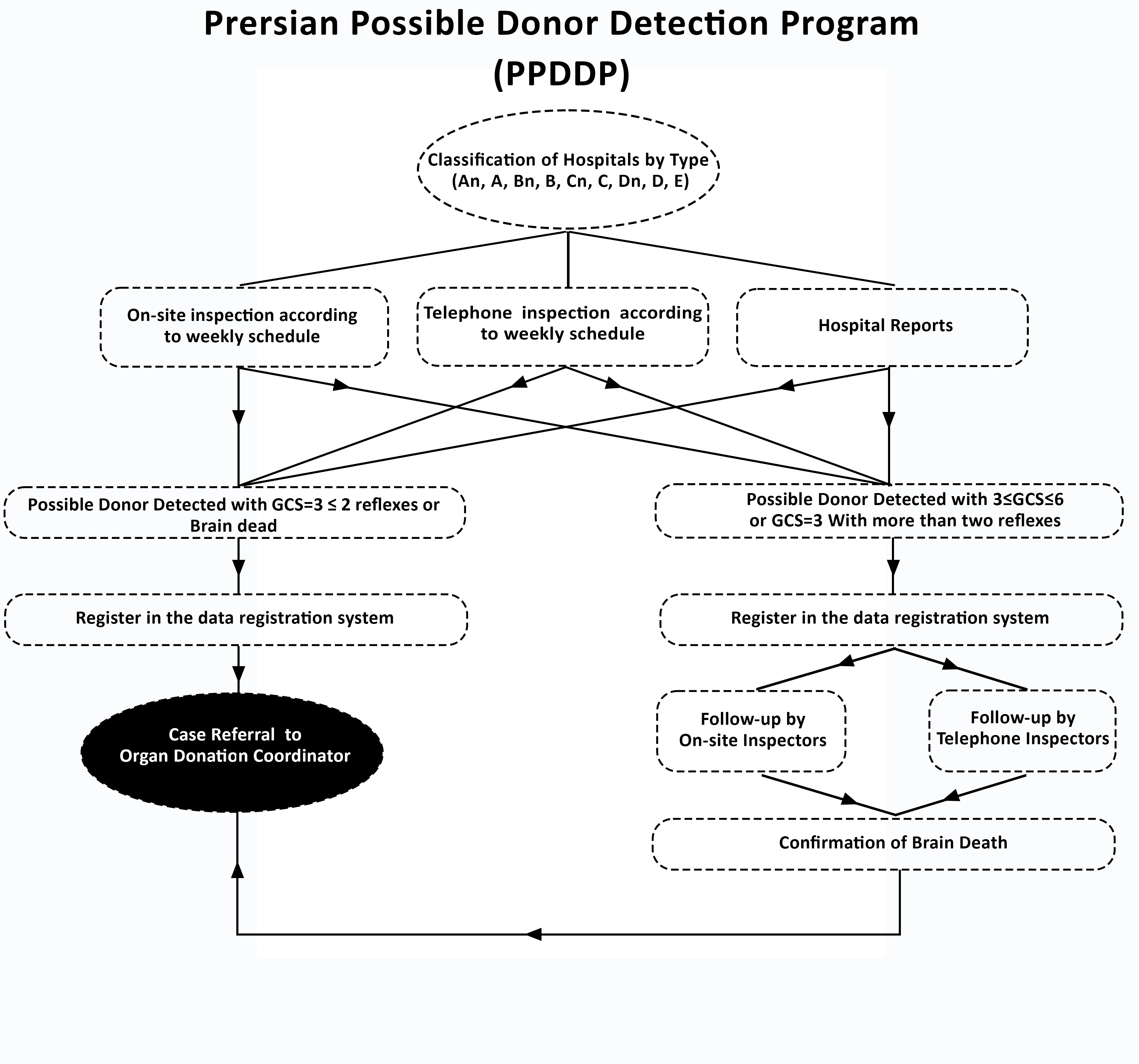 Methods: The present intervention was conducted through the OPUs of Shahid Beheshti University of Medical Sciences in Tehran which is responsible for managing the 113 included hospitals. In our new method aimed at maximizing the detection of brain-dead donors across all affiliated hospitals without requiring numerous in-hospital coordinators, we established on-site, telephone detectors, and enlisted some hospital staff as reporters. A monthly comprehensive schedule was devised for hospital assessments, aiming to optimize donor detection for both on-site and telephone detectors. This schedule factored in variables like the number of ICU beds and the presence or absence of neurosurgery/neurology wards. Furthermore, telephone and on-site inspections were coordinated to minimize the time gap between assessments. All of the detected possible ODs without a known contraindication for organ donation were evaluated by detectors to be categorized based on their prognosis. three separate categories of the now potential ODs (PODs) were defined: (I) PODs with Glasgow Coma Scale (GCS) scores of 4, 5, or 6, (II) PODs with a GCS score of 3 and a low clinical suspicion of brain death (at least one inconsistency with brain death diagnosis). Category II cases were further subdivided into two subcategories: Category IIA, comprising PODs with three or more brainstem reflexes, and Category IIB, comprising PODs with less than three brainstem reflexes, and (III) PODs with a GCS score of 3 and a high clinical suspicion of brain death (no detected inconsistencies with brain death diagnosis). All identified cases were recorded on the project's designated website (Figure 1).