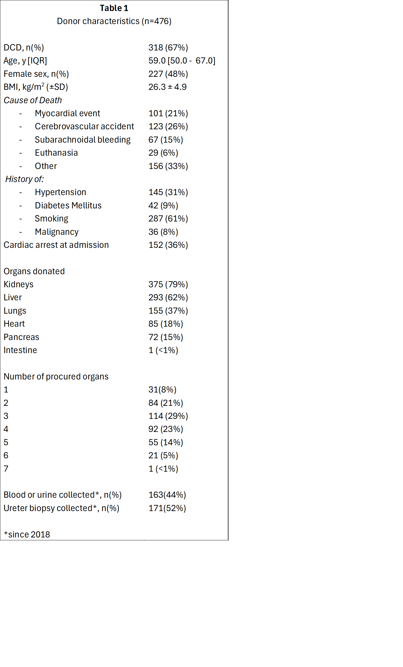 Results: To date, the study included 476 deceased (multi-) organ donors (Table 1), of whom 283 (59%) donated three or more organs. Median age was 59.0 [IQR: 50.0-67.0] years, 227 (48%) were female, and 318 (67%) donated after circulatory death. Since 2018, blood samples have been collected from 163 (44%) donors, and ureter biopsies have been obtained from 171 (52%) donors.