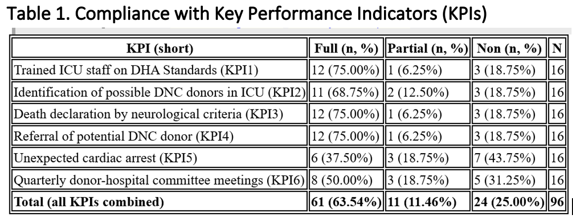 Methods: DHA Standards and Key Performance Indicators was established in (2023). A structured evaluation framework was applied to the identified busiest trauma hospitals (16 high-potential donor hospitals) in Dubai. Each hospital was assessed against 31 DHA criteria and 6 KPIs. Compliance was categorized as full, partial, or non-compliance. One of the main committee actions was the in-hospital seminars to achieve the target of at least 70% of the HCW trained in organ donation.