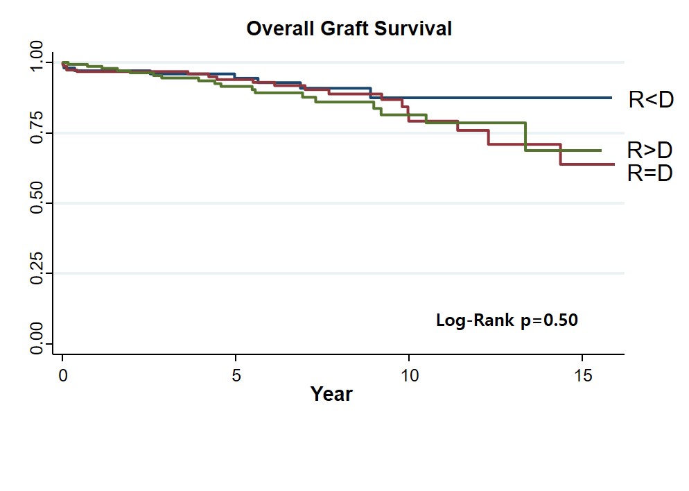 Results: The cohort was divided into 3 groups based on height discrepancy as 1) recipient ≥7 ㎝shorter than donor (R<D) 2) recipient within 7㎝ of donor’s height (R=D) 3) recipient >7 ㎝ taller than donor(R>D). There were 101 pairs in R<D, 151 pairs in R=D, and 143 pairs in R<D. The median follow-up duration was 6.2 years (IQR: 3.1, 9.3). Overall graft survival across height discrepancy between recipients and donors showed no statistical difference (Log Rank P=0.50).