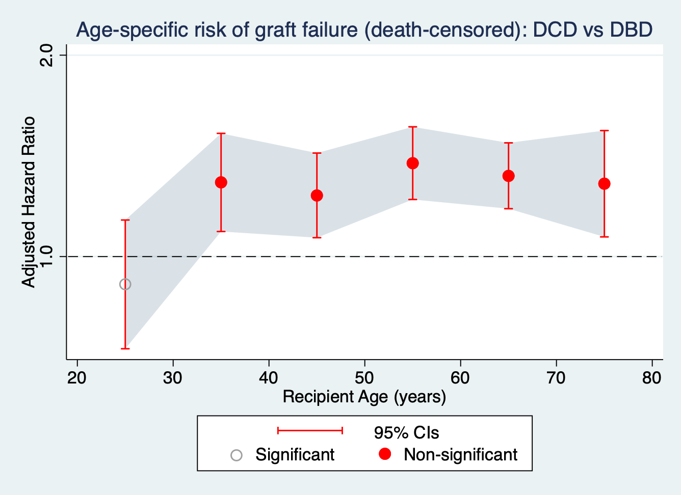 In contrast, death-censored graft failure showed a different pattern, with DCD kidneys demonstrating significantly higher graft failure risk across most age groups except for the youngest cohort (20-30 years). See Figure 2.