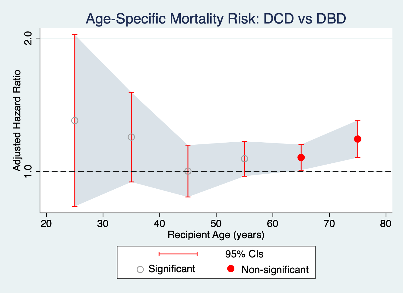 Results: A total of 116,396 kidney transplant recipients were analyzed across six age strata. For patient survival, DCD kidneys showed significantly increased mortality risk only in older recipients: ages 60-70 years (HR 1.08, 95% CI 1.01-1.15, p=0.03) and 70-80 years (HR 1.18, 95% CI 1.08-1.31, p=0.001). No significant mortality differences were observed in younger age groups (ages 20-60, all p>0.05). See Figure 1.
