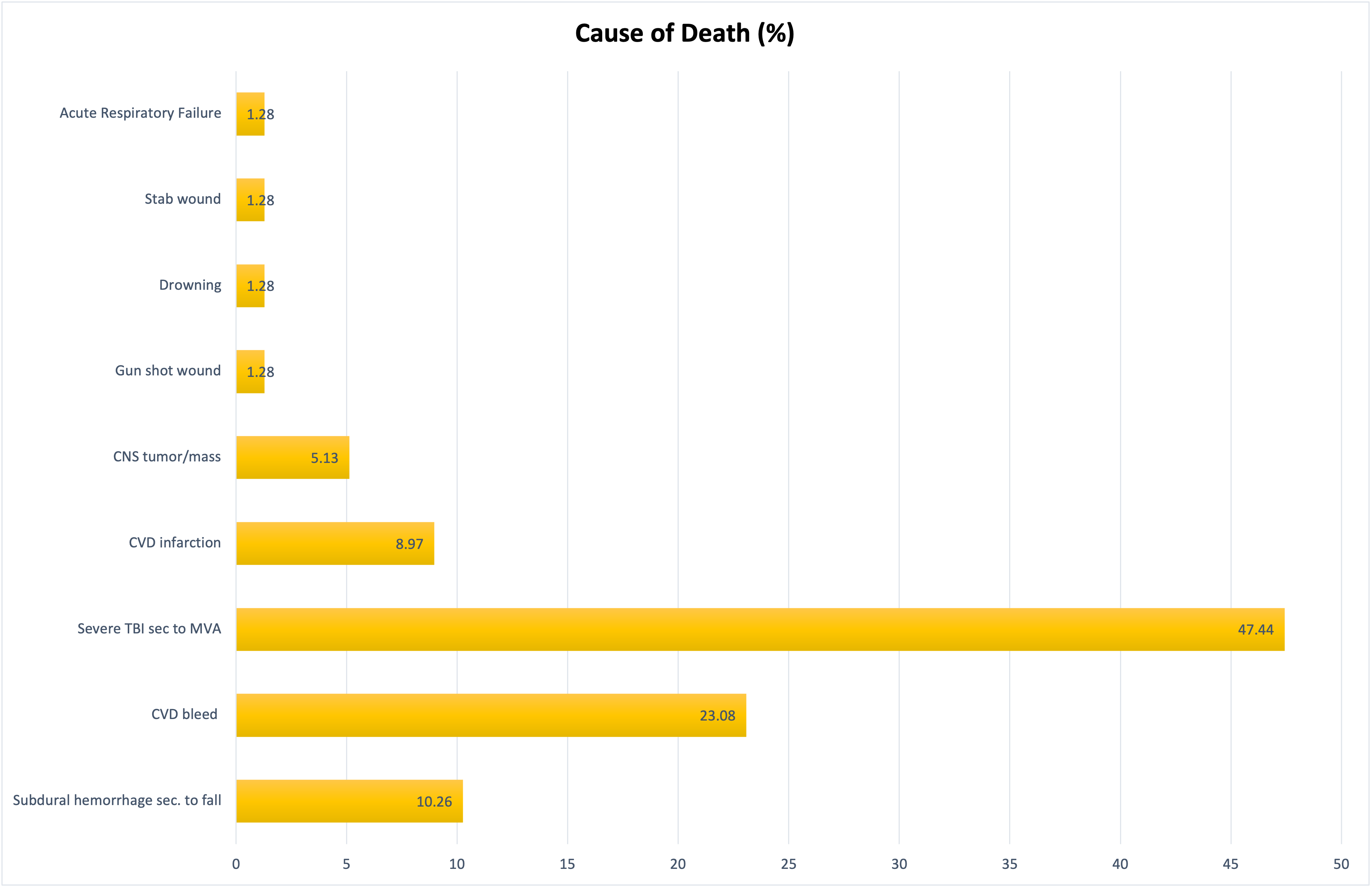 Trauma was identified as the primary reason for donor mortality, accounting for 60% (n=47) of the cases. Among these, severe traumatic brain injuries caused by motor vehicle accidents were the most commonly reported cause, representing 47% (n=37) of all donor deaths.